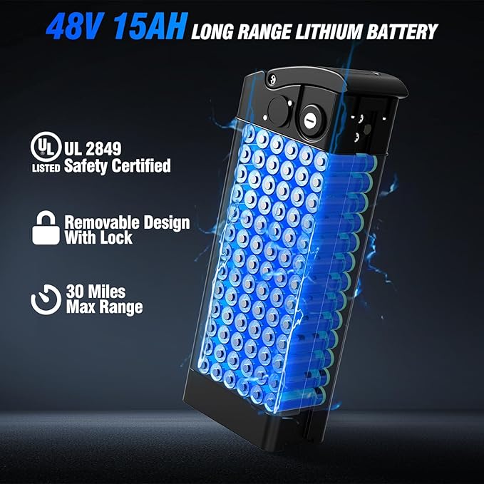 - HIGH CAPACITY BATTERY- 48V 15AH ebike battery with 3A fast charger can be quickly recharged in 3 hours, providing you with up to 30-45km of power for your ride (pedal assist mode)