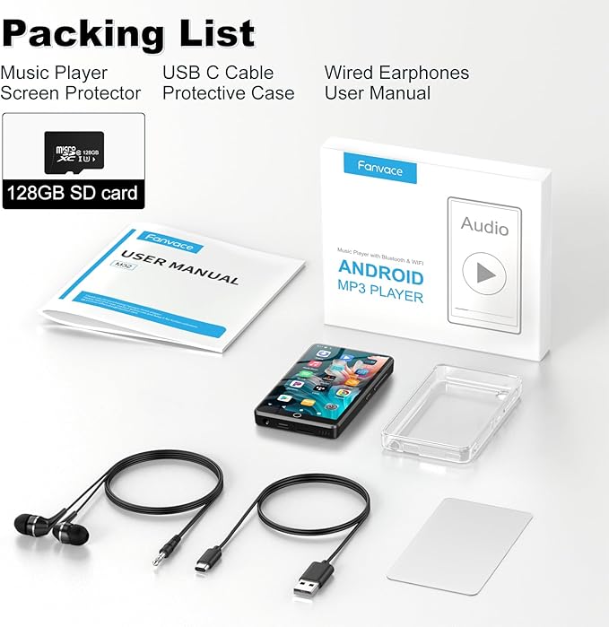 - 【Package Included】1 x MP3 Player, 1 x 128GB SD Card, 1 x USB C Cable, 1 x Wired Earphones, 1 x Screen Protector, 1 x Protective Case, 1 x User Manual; Our MP3 player with bluetooth provide 12 hours of customer service. Please contact us if you have any problem during your use, we will solve it for you within 12 hours. ---Noted: FAT32 format MicroSD card support ONLY!