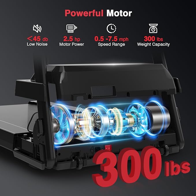 - 【Powerful and Quiet Motor】- Equipped with a 2.25 HP motor, this walking treadmill combines impressive power with quiet operation, supporting users up to 300 lbs. Its speed range, reaching up to 7.5 mph, accommodates both leisurely walking and more brisk jogging, ensuring a smooth and stable experience. Enjoy a reliable and peaceful workout tailored to your needs.