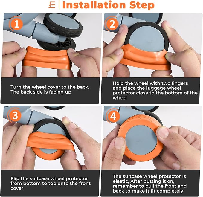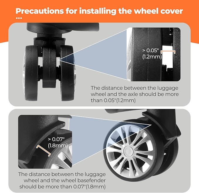 - [Fits Most Suitcases] These suitcase covers for luggage wheel are suitable for suitcases with wheel diameter between 2.0-2.4"(50-60mm),the distance between the luggage wheel and wheel base fender should be more than 0.07"(1.8mm),and the distance between the luggage wheel and axle should be more than 0.05"(1.2mm) ,This Suitcase wheel cover for luggage Suitable for 4x2 double wheels, not suitable for 4x1 single wheels luggage