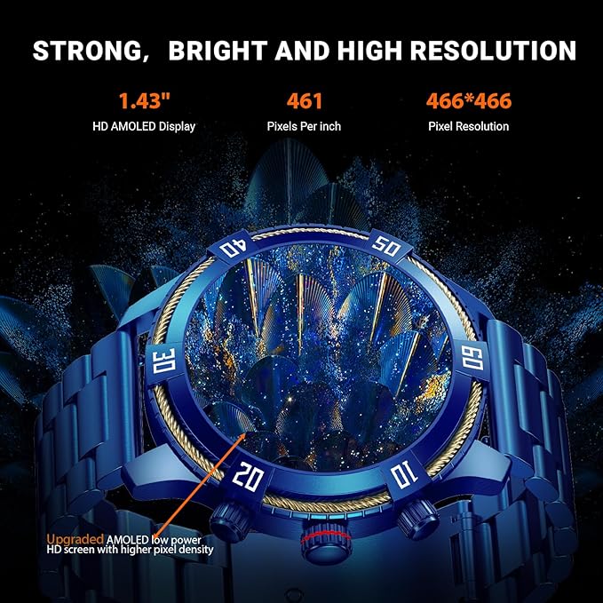 - Smart Watches for Men Easy to Use: Featuring a 1.43" AMOLED colour screen with a resolution of 466*466, it offers vivid and clear visuals. The rotating crown button allows effortless switching between dials and functions. Just flick your wrist to wake up the screen and instantly view social software messages