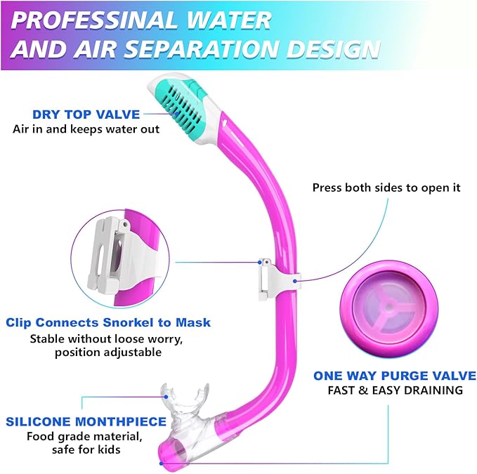 - 【Thickened Tempered Glass Lens】- The Diving Goggles are made of 4.0mm HD tempered glass lens, which is much more thicker and durable than other 3.2mm lens. It is impact resistant and explosion-proof, clear and safe. Dry-top snorkels have a mechanism that prevents water from entering the tube when submerged, making them a good choice for beginners