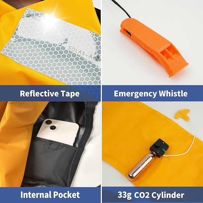 - Safety Features: Equipped with reflective strips for enhanced visibility, an emergency whistle, and a CO2 cylinder for reliable inflation in emergencies