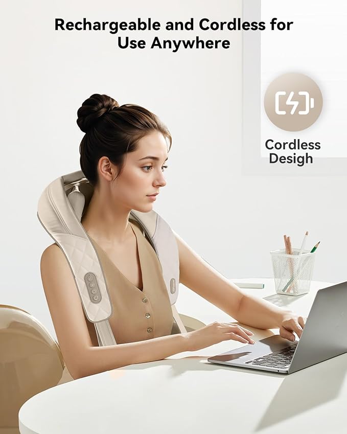 - 【Large Capacity Battery & Portable Durability】With daily use, this cordless neck massager lasts up to a week on a single charge. Featuring USB Type-C charging, it works wirelessly without being tethered to an outlet, letting you enjoy relaxing massages anytime, anywhere. Its compact size makes it easily portable, fitting into regular-sized travel bags, gym bags, or carry-ons.