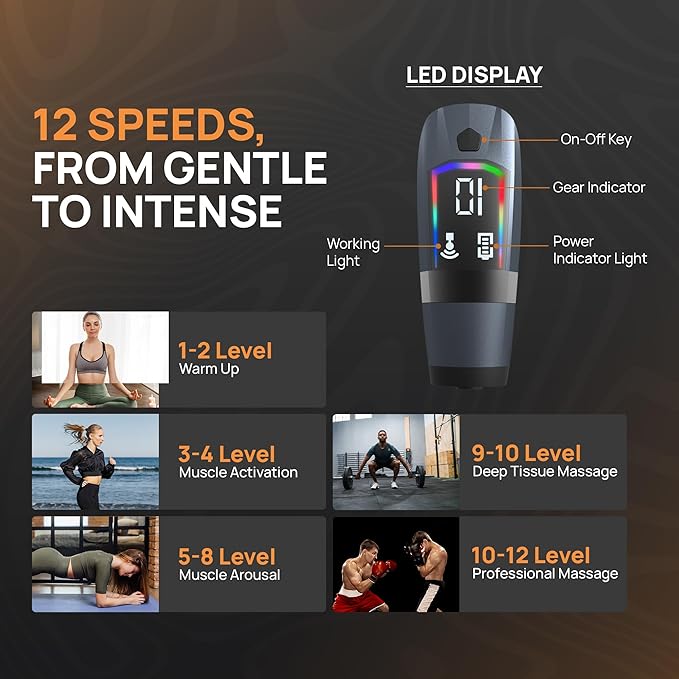 - 𝟏𝟐 𝐒𝐩𝐞𝐞𝐝 𝐋𝐞𝐯𝐞𝐥𝐬 𝐰𝐢𝐭𝐡 𝐋𝐂𝐃 𝐏𝐫𝐞𝐜𝐢𝐬𝐢𝐨𝐧 𝐂𝐨𝐧𝐭𝐫𝐨𝐥: This Electric Muscle Relaxation with 12 adjustable speed settings ranging from (2200 RPM) to deep tissue therapy (3500 RPM). The LCD screen displays battery life, speed, and timer for effortless adjustments.