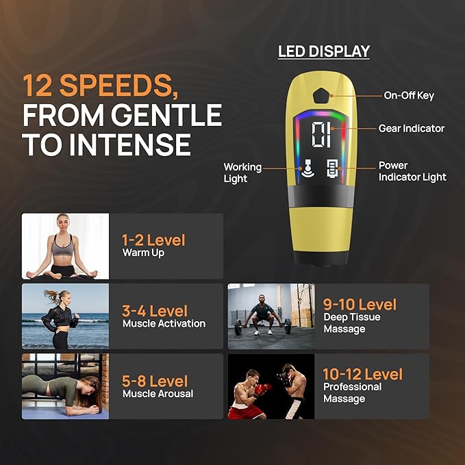 - 𝟏𝟐 𝐒𝐩𝐞𝐞𝐝 𝐋𝐞𝐯𝐞𝐥𝐬 𝐰𝐢𝐭𝐡 𝐋𝐂𝐃 𝐏𝐫𝐞𝐜𝐢𝐬𝐢𝐨𝐧 𝐂𝐨𝐧𝐭𝐫𝐨𝐥: This Electric Muscle Relaxation with 12 adjustable speed settings ranging from (2200 RPM) to deep tissue therapy (3500 RPM). The LCD screen displays battery life, speed, and timer for effortless adjustments.