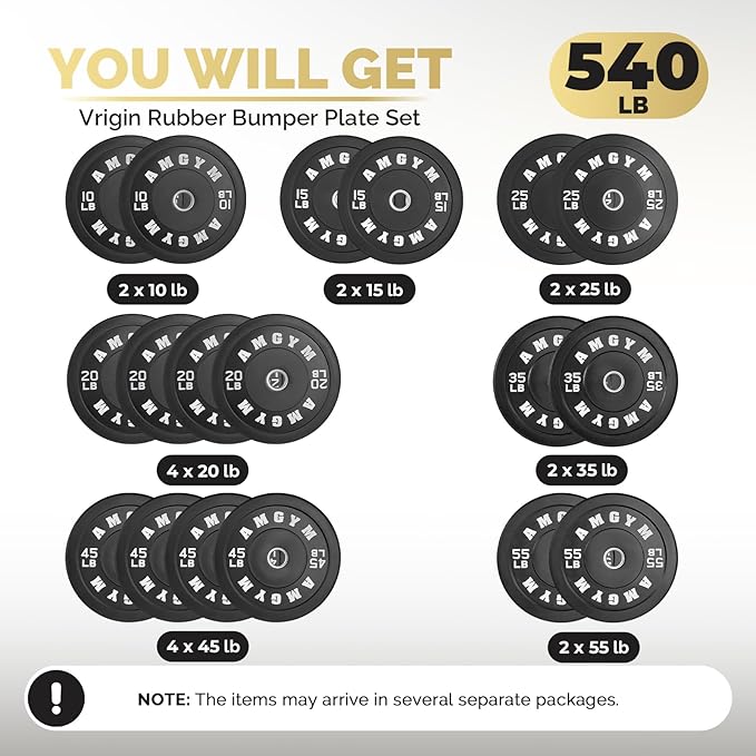 - PACKAGE INCLUDES: Includes 2 x 10LB, 2 x 15LB, 4 x 20LB, 2 x 25LB, 2 x 35LB, 4 x 45LB, and 2 x 55LB bumper plates made from 100% virgin rubber, compatible with all Olympic barbells with 2-inch sleeves.