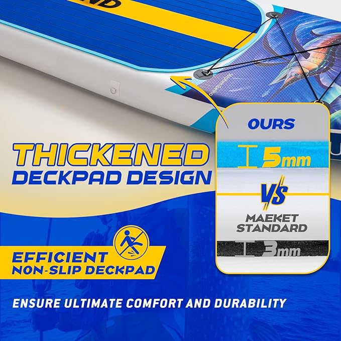 - Thickened deckpad:We used premium 5mm deckpad foam to ensure ultimate comfort and durability for our boards.Relax the feet to make body more comfortable and not too painful to fall on the board. Most company’s use much thinner deckpad but this is a testament to our quality and not cutting corners in every step of our board design