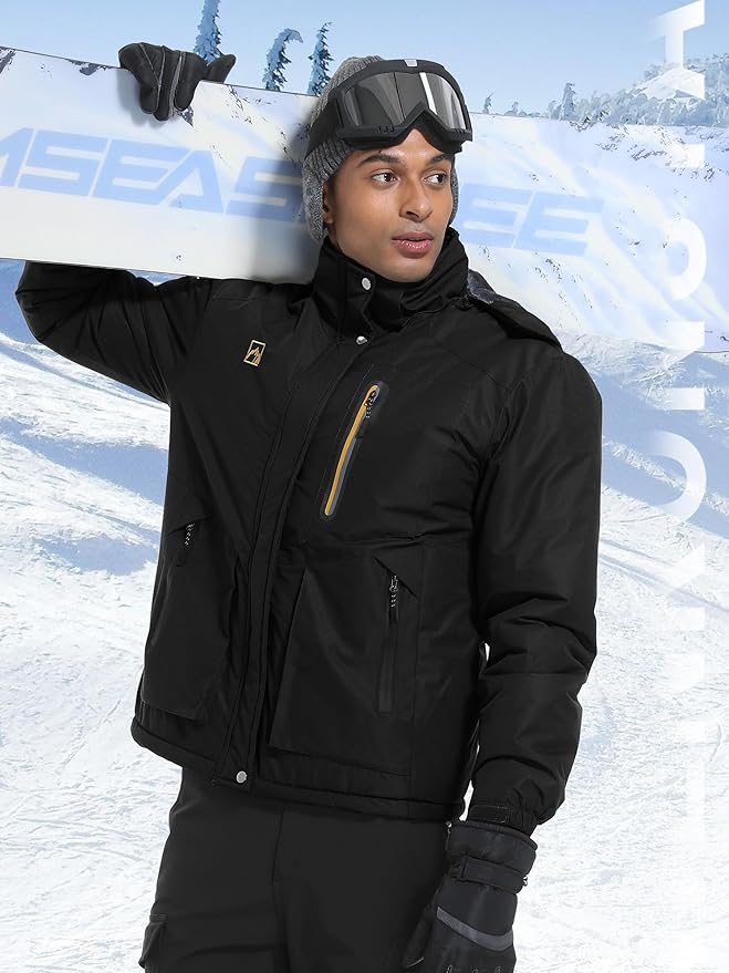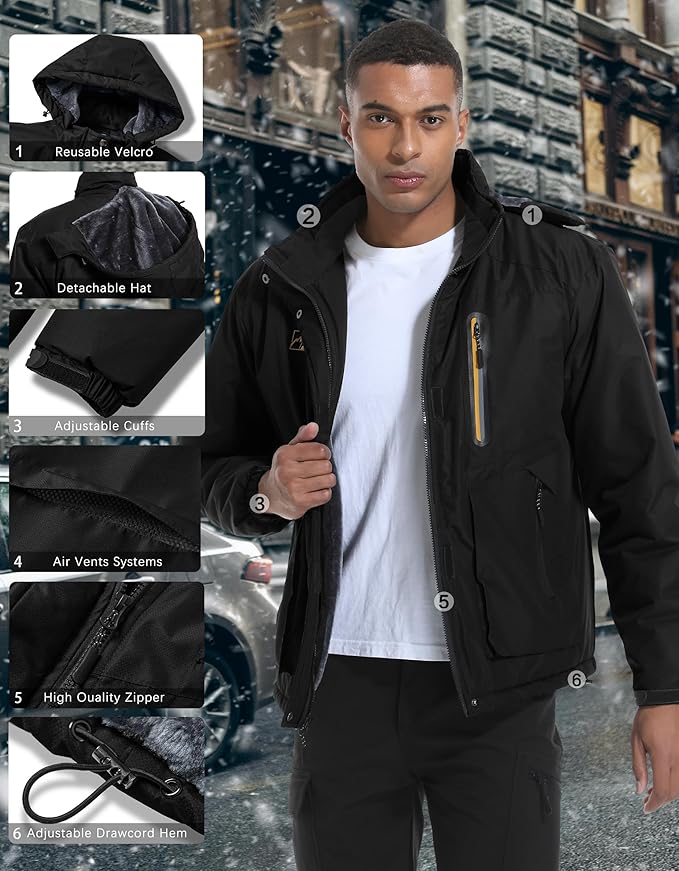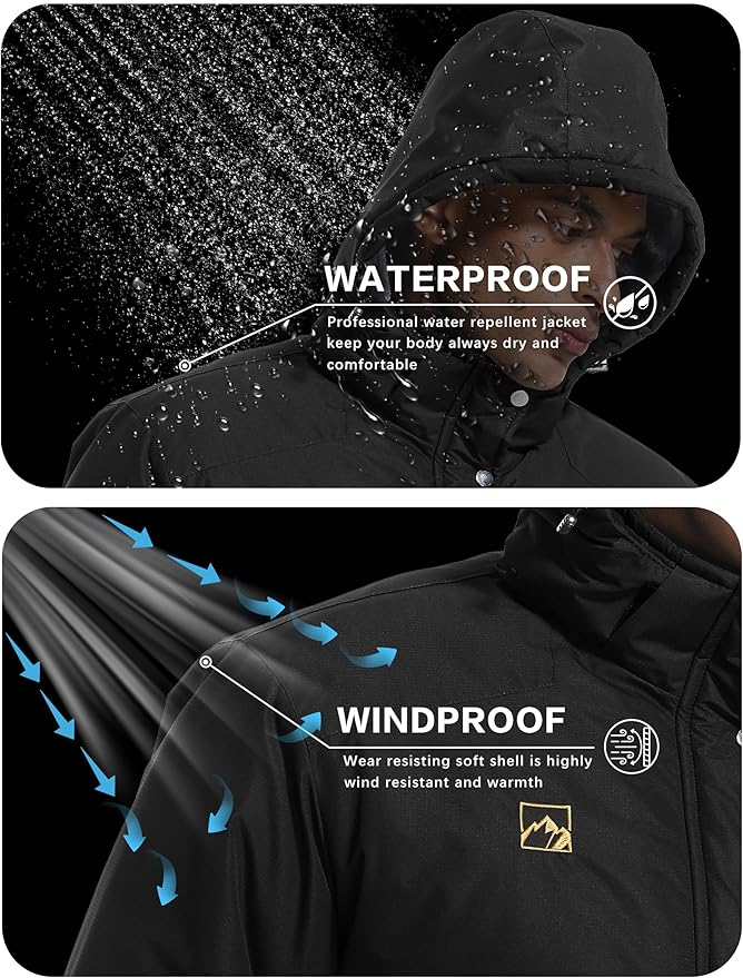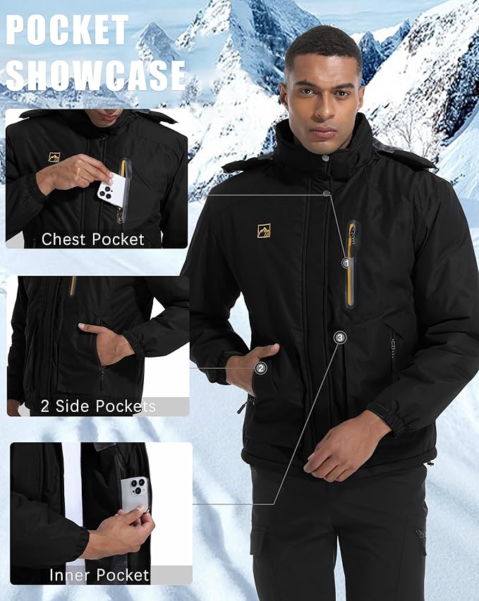 • Utility Pockets Coat: Men's snow jacket has 4 pockets 1 zipper chest pocket, 2 huge zipper side pockets, and 1 deep inner zipper pocket, which can protect the safety of personal items such as phones, wallets, keys, etc