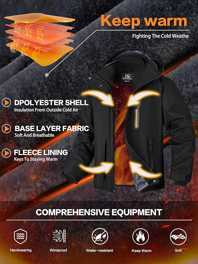 • Warm Winter Jacket: This jacket's warm fleece lining offers exceptional insulation and effectively locks in body heat, keeping you cozy and dry during your skiing adventures, hiking trips, or other outdoor pursuits