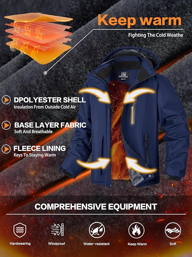 • Warm Winter Jacket: This jacket's warm fleece lining offers exceptional insulation and effectively locks in body heat, keeping you cozy and dry during your skiing adventures, hiking trips, or other outdoor pursuits