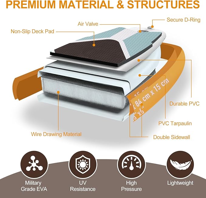 - [Premium Material] Our inflatable paddle boards for adults are made from quality military grade PVC material for durability and longevity. They feature a dual-layer PVC construction that combines light weight with strength, providing increased stiffness for superior performance on the water. Whether you’re navigating calm waters or tackling rough currents, our paddle boards deliver superior performance.