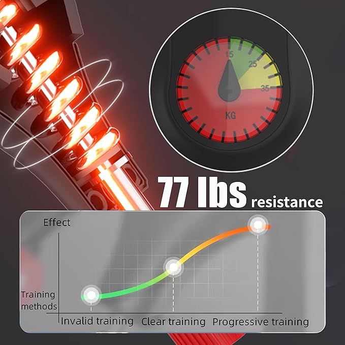 - Adjustable Resistance from 0-77 lbs with Visible Pressure Gauge Customize your workout intensity with adjustable resistance ranging from 0 to 77 lbs, monitored by a clear pressure gauge for precise control.