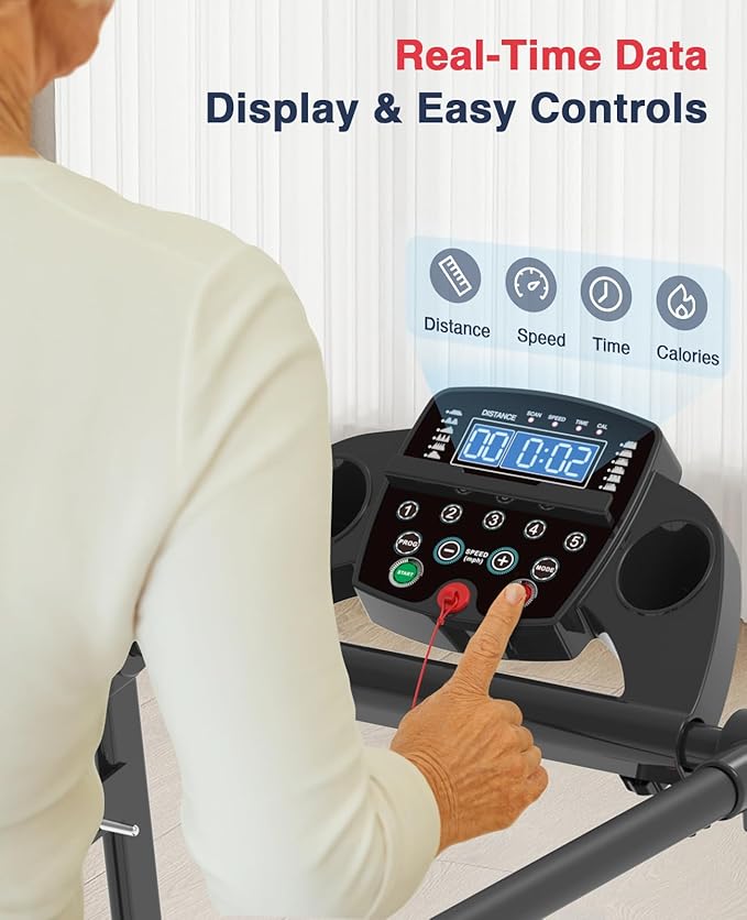 - 【User-Friendly LED Display】- The treadmill for seniors is equipped with a multifunctional LED display, making it simple to monitor time, speed, distance, and calories at a glance. With 12 preset programs and 3 control modes, it supports a variety of fitness goals. Extra features like a cup holder, magnetic safety key, and supportive handlebars provide added convenience for a comfortable and enjoyable workout.