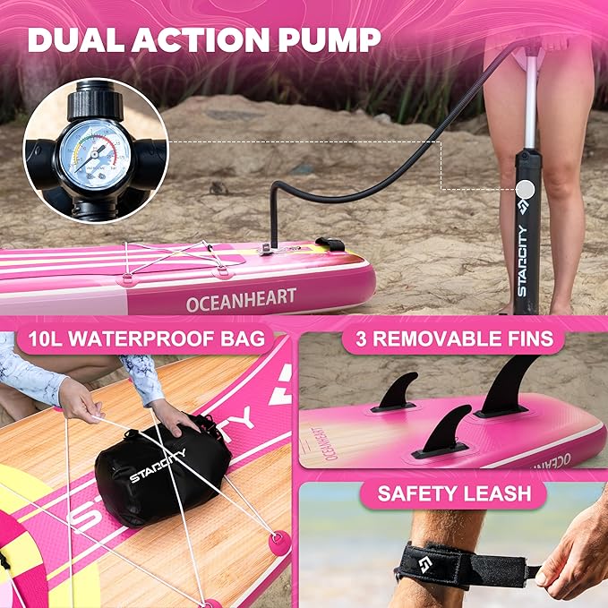 • 【Quick inflation/deflation, convenient travel】STARCITY paddle board comes with a double-action pump that inflates adult paddle boards for adults to the desired firmness in just a few minutes. Venting is also straightforward, thanks to a uniquely designed valve that can be pressed down to completely release air. Additionally, the paddle board can be easily folded and stored in the high-quality backpack included, making it convenient to carry and transport.