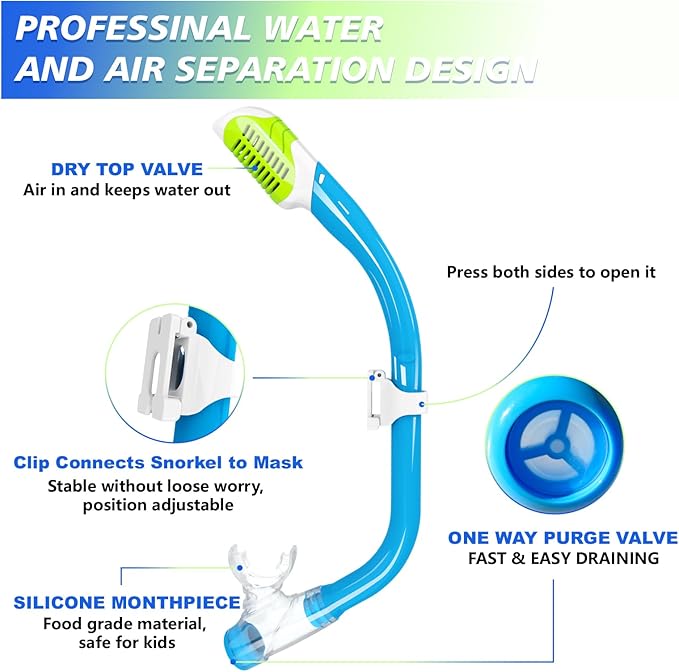 - 【Thickened Tempered Glass Lens】- The Diving Goggles are made of 4.0mm HD tempered glass lens, which is much more thicker and durable than other 3.2mm lens. It is impact resistant and explosion-proof, clear and safe. Dry-top snorkels have a mechanism that prevents water from entering the tube when submerged, making them a good choice for beginners