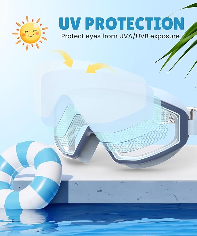 - Clear Vision Underwater: Swimming goggles equipped with anti fog and UV400 protection lenses, our kids goggles offer unparalleled clarity and eye protection. Whether it's a sunny day at the beach or a swimming pool, your child will enjoy a clear view while staying safe from harmful rays. Dive into fun with confidence