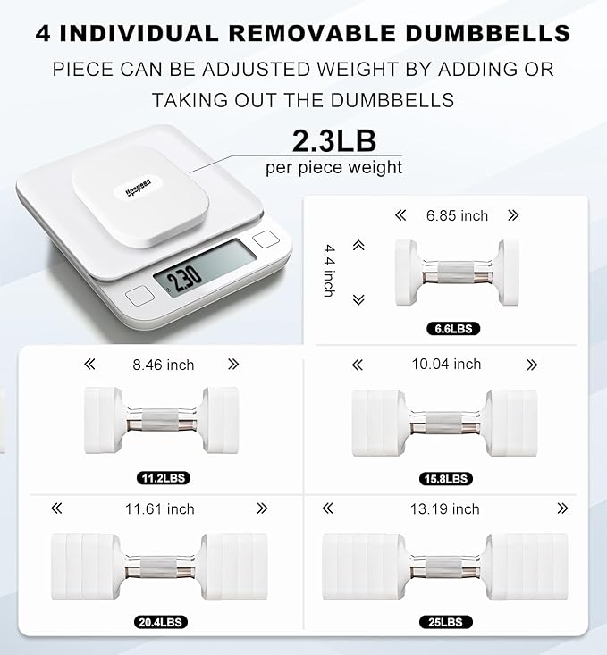- 5 in 1 Adjustable Hand weights dumbbells set for men women. Our dumbbell sets consists of 10 weight dumbbell plate, adjustable range is 6.6lb, 11.2lb, 15.8lb, 20.4lb, 25lb each weight (A Pair 13.2lbs 22.4lbs 31.6lbs 40.8lbs 50lbs).
