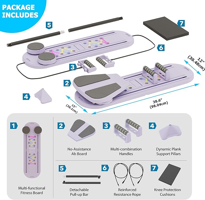 - Multi-Purpose Pilates Board: Achieve a complete workout targeting your core, legs, arms, and back with this Pilates board. It integrates the features of a Pilates board, ab roller wheel, resistance bands, push-up handles, balance board, and planks