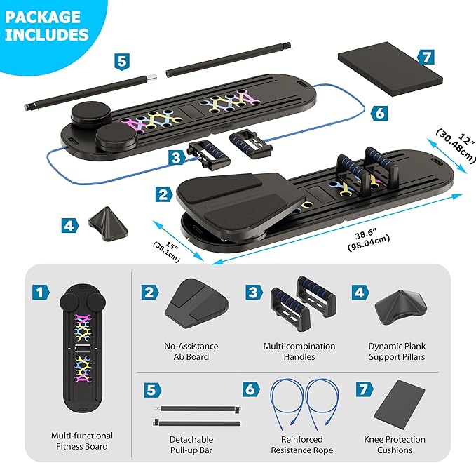 - Multi-Purpose Pilates Board: Achieve a complete workout targeting your core, legs, arms, and back with this Pilates board. It integrates the features of a Pilates board, ab roller wheel, resistance bands, push-up handles, balance board, and planks