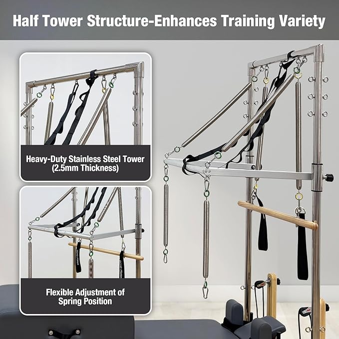 - The Integrated Reformer Tower Includes (Inside the box) - 1 Jump board; 1 Large sitting box; 2 Shoulder rests; 1 Pair of Y shape (double loop handles) straps for arms and legs; 1 Pair of pulleys; 1 Pair of ropes; Stoppers; 6 Springs for the carriage; 4 Springs for the tower; Push up bar; Half tower. Pilates equipment and is a recommended machine for both private home use and professional use in commercial studios