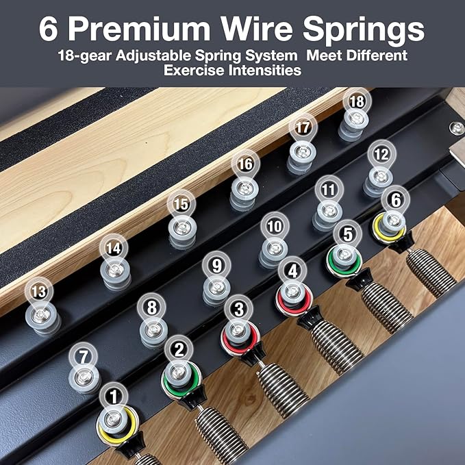 - Premium Pilates Exercise Equipment: Our Pilates machine features a durable solid wood frame and components made of stainless steel and aluminum. Supporting up to 400 lbs. Equipped with 6 premium wire springs and 18 hooks, endurance-tested high-quality springs with a service life of more than 300,000 stretches. Multi-directional wheels and smooth tracks ensure seamless movement