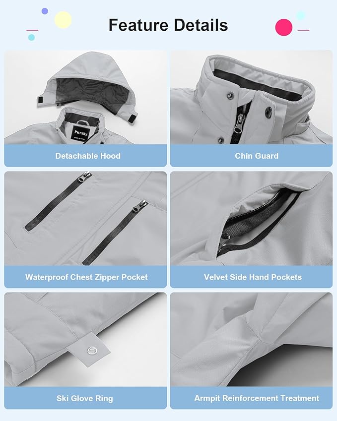- ?�‚ Quality Details: 1. SBS smooth zipper. 2. helmet-compatible hood allows you to resist the cold wind during skiing, and will not let your kids' forehead get wet on rainy days. 3. 2 handwarmer zipper pockets and 2 chest zipper pocket can store keys, card and to prevent items from being lost in the snow. 4. well made and tailored with reinforced stitching.