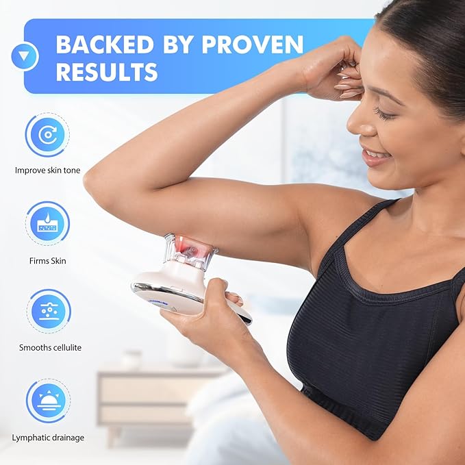 - Tackle every part of your body with ease: 3-in-1 technology works on thighs, stomach, arms, legs, and booty, offering targeted sculpting, toning, and lymphatic drainage. It's a customizable solution tailored to your needs, with interchangeable cups for different areas and adjustable settings.