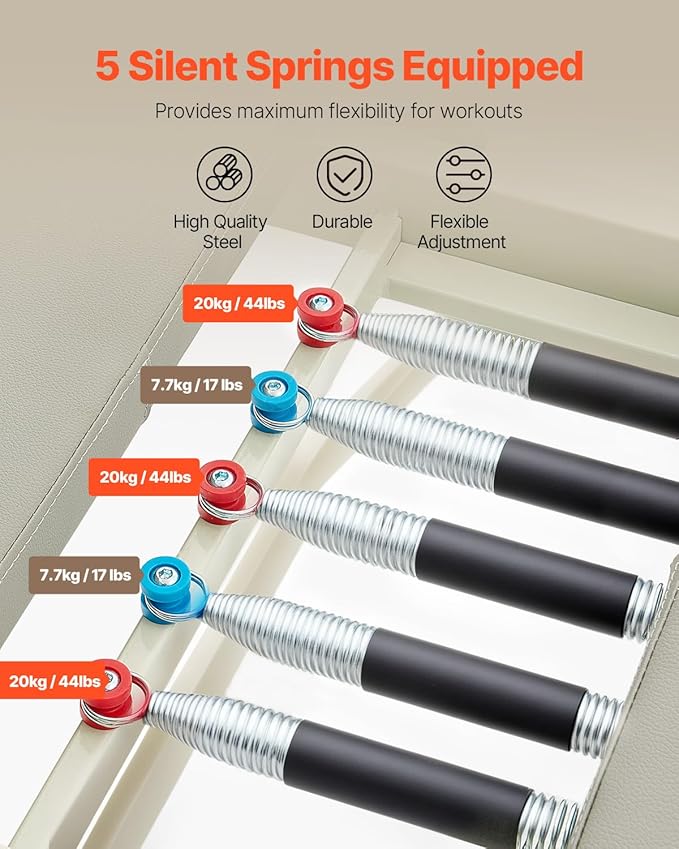 - Premium Springs: Crafted with high-quality steel spring, this home workout pilates equipment offers 5 levels of spring resistance to help you effectively target your upper body, lower body, and core muscles. The set includes 3 strong springs (red) and 2 light springs (gray)