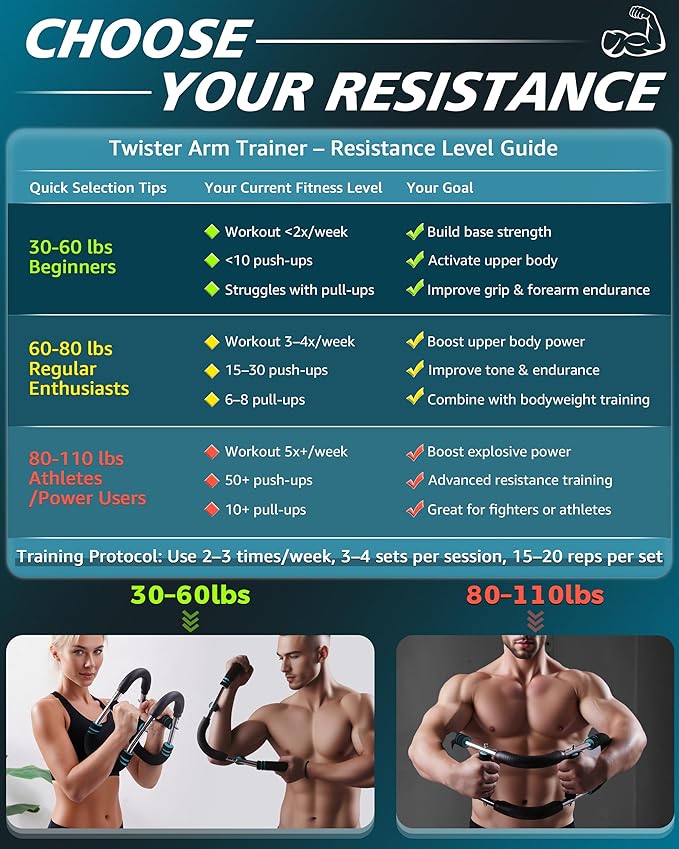 - Resistance Pick Guide: Available in 30-60lbs and 60-80lbs options—30-60lbs is perfect for beginners looking to build base strength, improve grip endurance, and activate upper body muscles; 60-80lbs is ideal for regular strength trainers aiming to improve tone, muscular endurance, and enhance bodyweight routines.