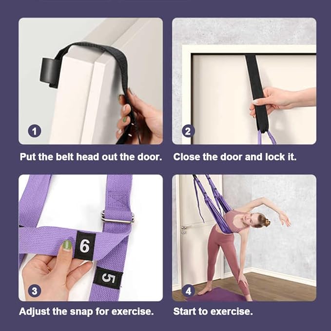 - No-Door-Drill Yoga Strap: Hangs over any standard door with adjustable loops. Close the door to secure – no tools or wall damage. Adjust the height for backbends or leg stretches in seconds.