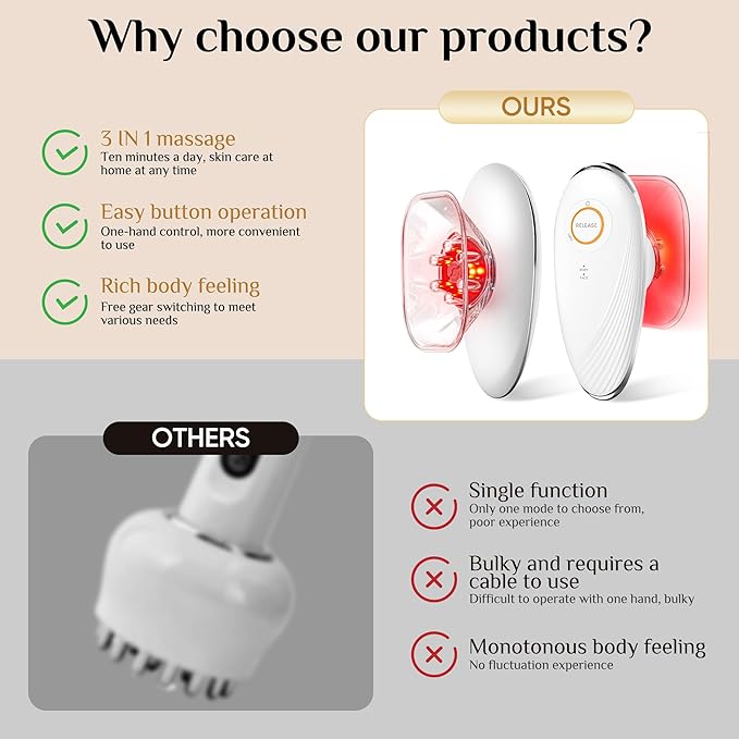 - 3-IN-1 BODY SCULPTING MACHINE: This electric cellulite machine combines the 3-in-1 functions of scraping, cupping and massage, which can effectively lift and tighten the skin, help muscles contract and relax, and make the skin softer, smoother and more radiant.