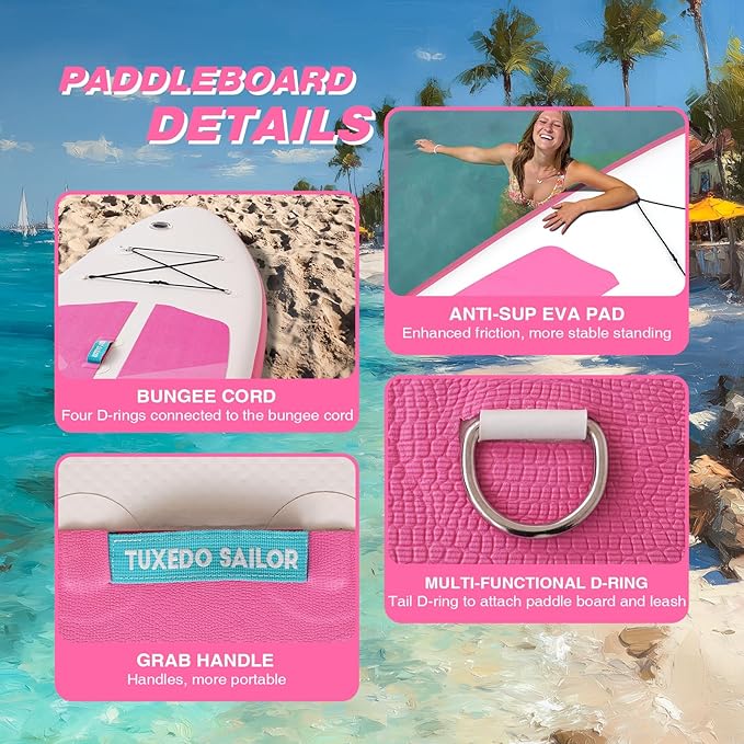 - 5.【Complete SUP Accessories】This Tuxedo Sailor paddle board set includes a adjustable single-blade paddle, manual pump, fins, leash, and backpack, giving you everything needed for a perfect paddleboarding experience.