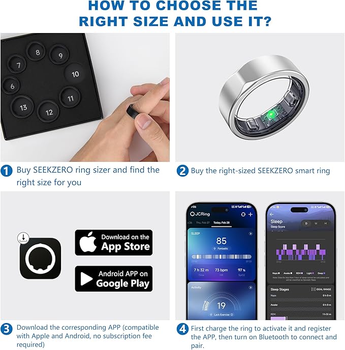 - 🔧【Easy Setup for First-Time Use】 To start using your SEEKZERO smart ring, simply charge it to activate. After charging, download the companion app, enable Bluetooth on your phone, and open the app to connect the ring for a seamless sync.