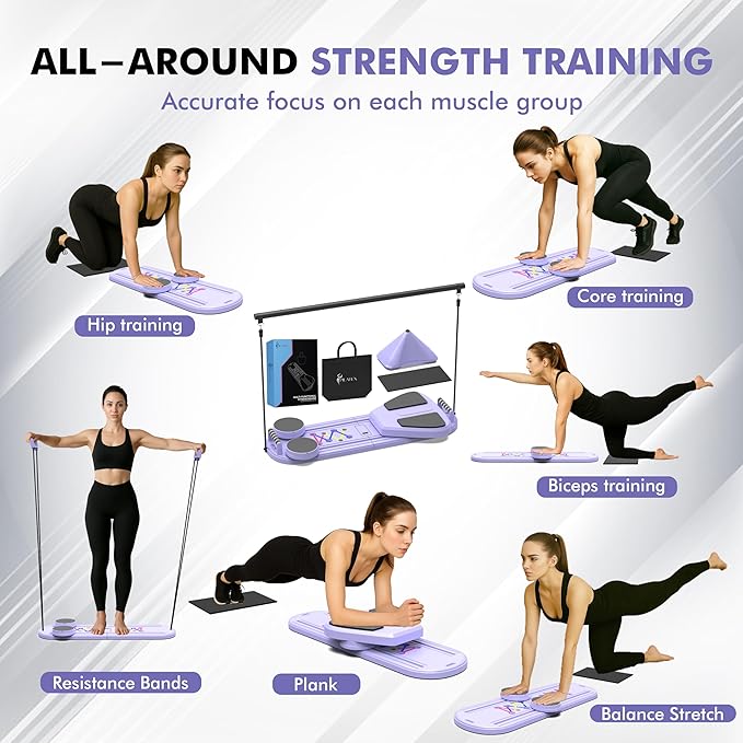 - Multifunctional Training Equipment: Equipped with a resistance bands set, ergonomic handles, slide board, plank board and a thick knee pad, this portable Pilates reformer is a complete strength training equipment, that allows you to train your core and abs, or work on your arms, balance, or mobility training for a full-body workout.