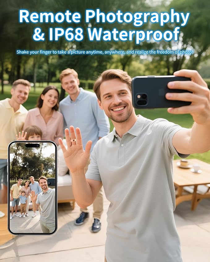 - 🎀【Gestures Photo and Waterproof】This ultra-thin smart ring can be used to slide to remotely take photos, and can capture beautiful moments effortlessly. The smart ring meets IP68 waterproof standards, and no need to remove the ring, making your life more fun, whether you are washing your hands, showering or swimming in shallow water.