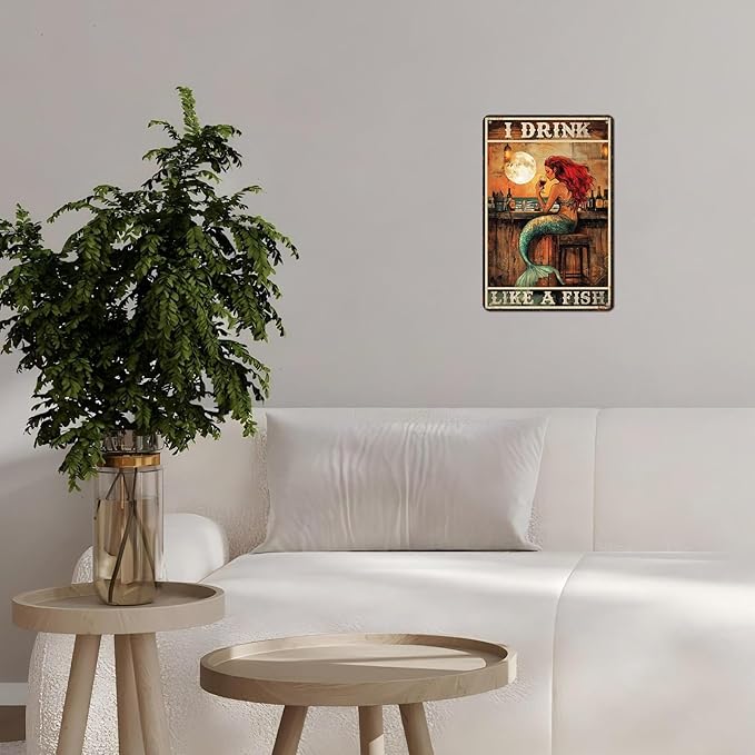 Vintage Mermaid Tin Sign I Drink Like A Fish Retro Wall Decor Decorations for Home Funny Wine Lover Nostalgic Metal Poster Indoor Store Cafe Toilet Kitchen Garden Bar Pubs Man cave 12 * 8inch