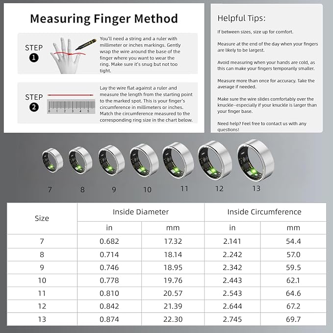 - 【Size Before You Buy】Before purchasing the Smart Ring, we highly recommend referring to the size chart and measuring your finger circumference to ensure the most comfortable fit and avoid unnecessary returns or exchanges