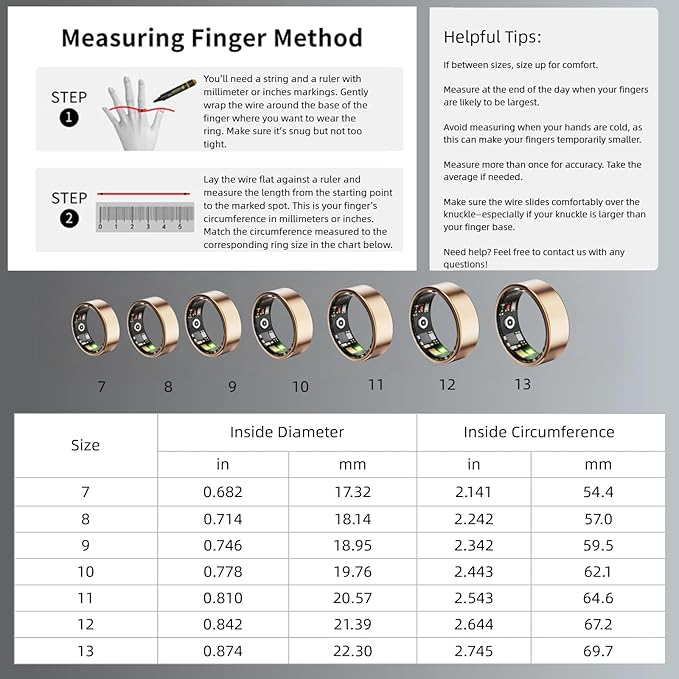 - 【Size Before You Buy】Before purchasing the Smart Ring, we highly recommend referring to the size chart and measuring your finger circumference to ensure the most comfortable fit and avoid unnecessary returns or exchanges