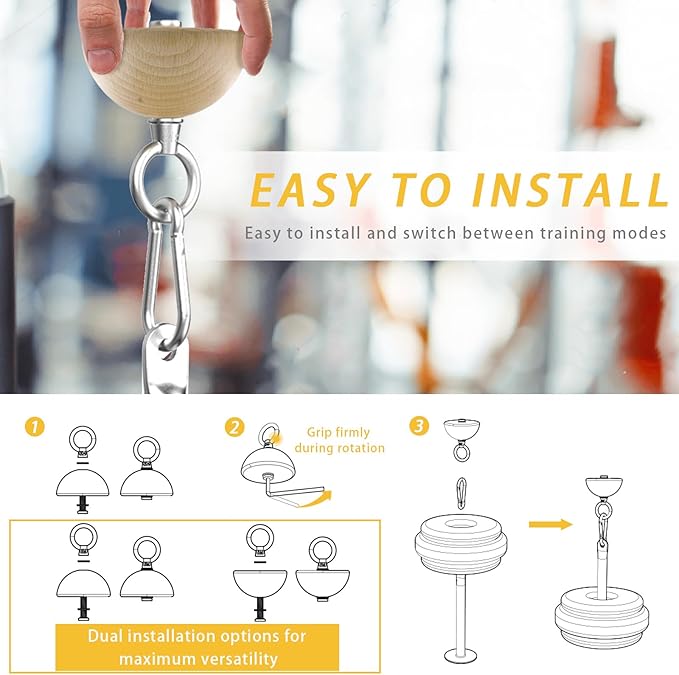 - 🔧 Easy Setup with Included Tool Each set includes a wrench for quick and secure installation. The heavy-duty steel ring and carabiner make it easy to connect to cable machines, resistance bands, or anchor points.
