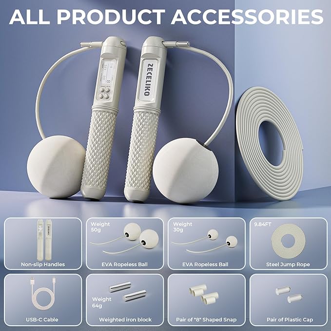 - 3.Weighted & Cordless Jump Rope: Includes four EVA foam balls (two 30g and two 50g) for silent cordless jumping; switch instantly between cordless and traditional modes; great for low ceilings or noise-sensitive areas; the included 64g iron weights attach to the handles for extra resistance, perfect for HIIT or strength training