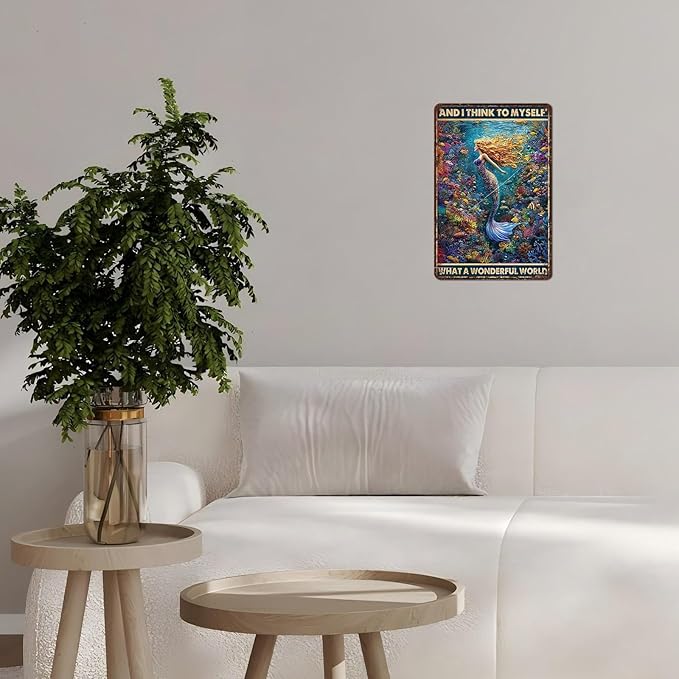 Retro Mermaid Tin Sign And I Think to Myself What a Wonderful World Vintage Metal Poster Funny Wall Art Toilet Bathroom Man Cave Bar Cafe Indoor Room Garage 12 * 8inch