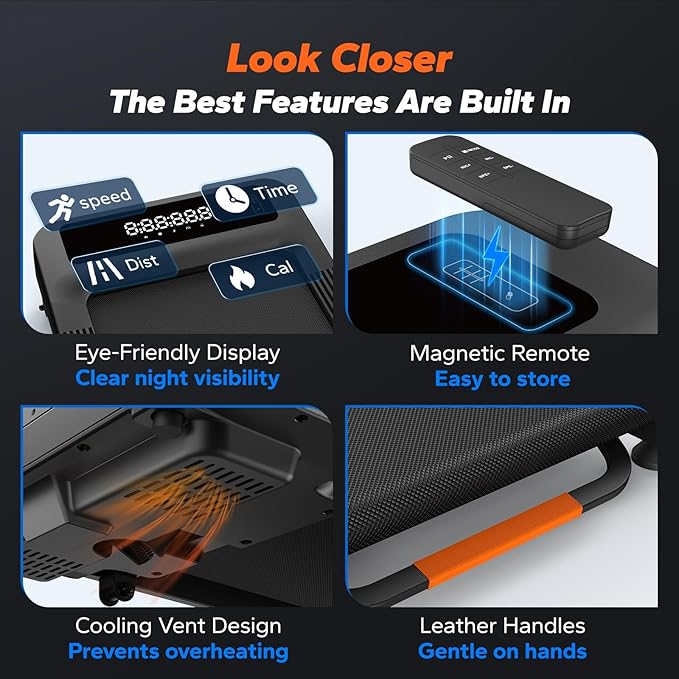 - 【Multi-Zone Cushioning, Joint Protection】 Smart Shock Absorption | 30 % Reduced Knee Stress. This walking treadmill features a professional cushioning frame and 6-layer shock-absorbing non-slip belt, significantly reducing joint pressure while protecting knees/ankles. The 16.5″-wide running belt (vs. standard 13.8″) ensures stable footing with enhanced safety.