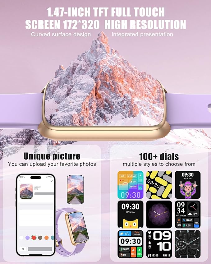 • 【1.47" Touchscreen & 200+ Dials】Enjoy a crystal-clear 1.47-inch TFT display with brilliant clarity and responsive touch control. The GloryFit app offers over 200 stylish watch faces, plus the option to upload your own photo for a personalized look. This feature-rich display seamlessly combines advanced functionality with custom style, elevating your smart watch experience.