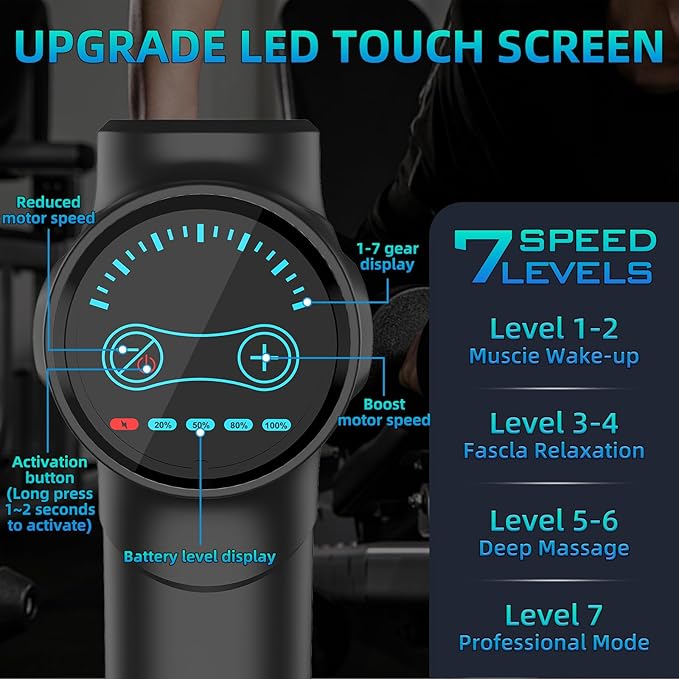 - 【Ultra-Quiet Expperience】:Adopting high-quality quiet motor, the muscle massager gun operates at a quiet 40-50dB noise level, it guarantees ultra-quiet performance,don't worry about disturb others whether you’re in the office, gym, or at home.Provide you with a good experience
