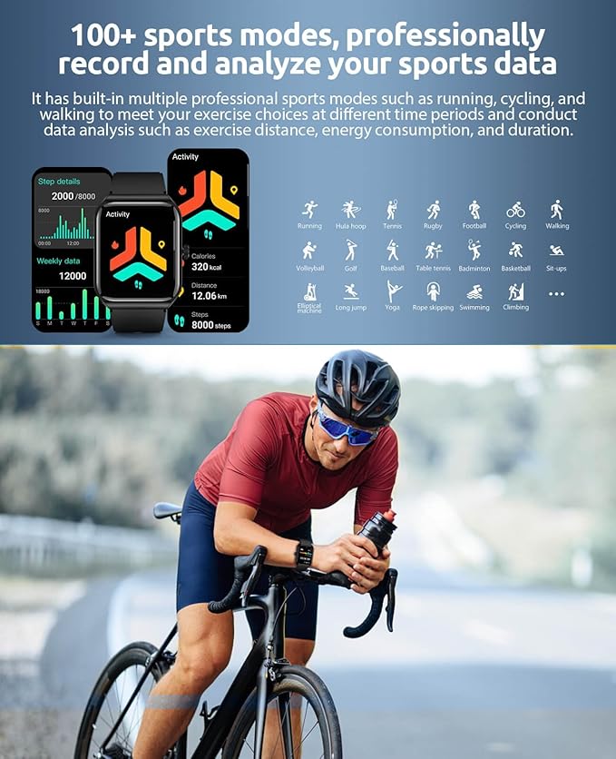 - 【100+ Scientific Sport Modes】With over 100 built-in exercise modes, including running, cycling, strength training, skiing, surfing, and yoga meditation, it accurately monitors every heartbeat to help you improve your fitness. Leveraging your phone's GPS, it provides real-time guidance to ensure you're on track every step of the way. Daily monitoring of steps, calories burned, and exercise duration, combined with 7-day trend analysis, helps you adjust your goals and visualize your progress. Choosing our watch makes healthy living simpler and more scientific!