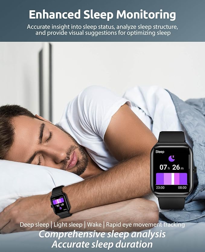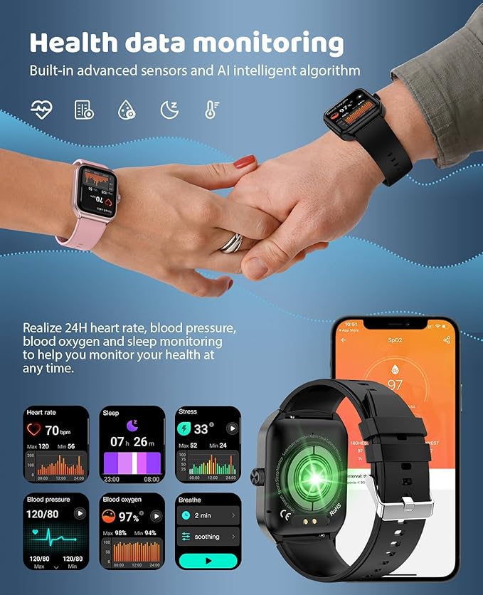 - 【Weather Health Monitoring】The smartwatch has functions such as sleep, heart rate, blood oxygen monitoring and breathing training to help you better control your physical and mental health. Intelligent sleep analysis helps you improve your sleep quality in a targeted manner. During exercise, the real-time heart rate function helps you optimize exercise intensity. And blood oxygen monitoring will indicate abnormal breathing. Combined with guided breathing exercises, it helps you relax better.