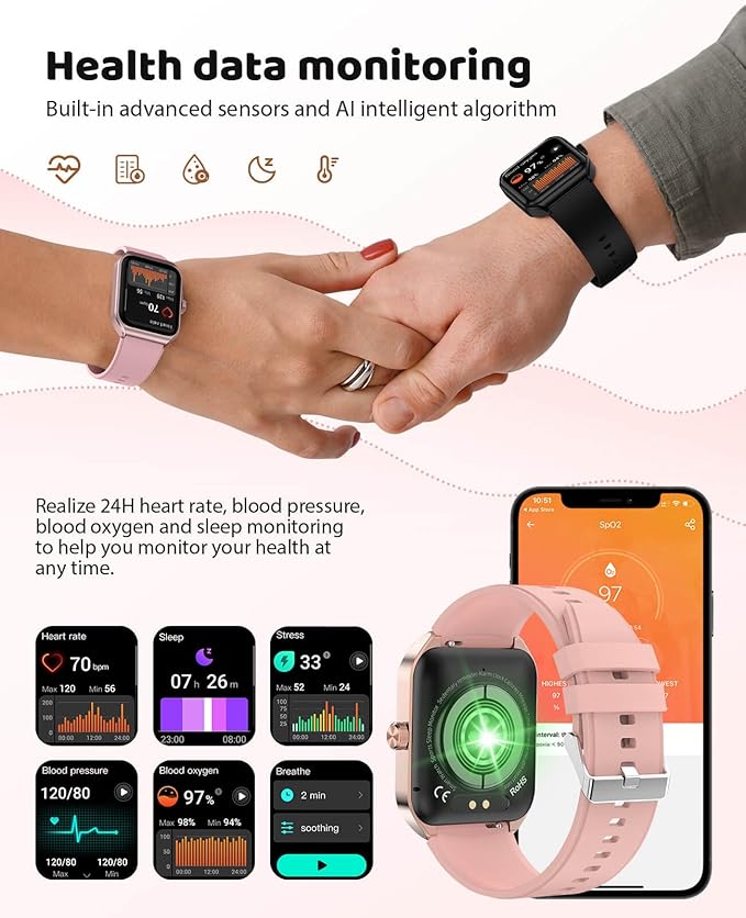 - 【Weather Health Monitoring】The smartwatch has functions such as sleep, heart rate, blood oxygen monitoring and breathing training to help you better control your physical and mental health. Intelligent sleep analysis helps you improve your sleep quality in a targeted manner. During exercise, the real-time heart rate function helps you optimize exercise intensity. And blood oxygen monitoring will indicate abnormal breathing. Combined with guided breathing exercises, it helps you relax better.