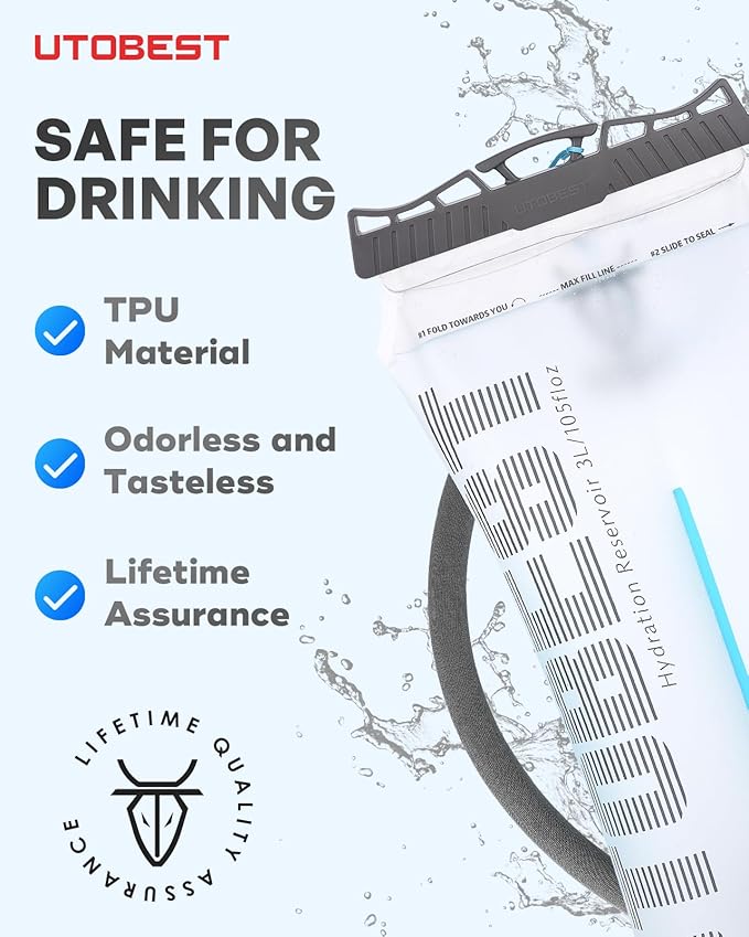 - Safe Drinking: UTOBEST 3L hydration bladder is made of food-grade TPU, safer and more durable than PEVA/EVA. Odorless, tasteless, and BPA-free. The soft bite valve has a protective cap to keep dirt out, ensuring safe drinking