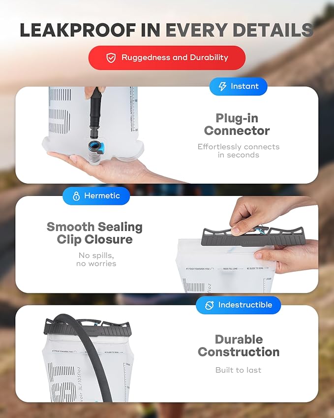- Leakproof and Easy to Dry: The hydration bladder has a plug-in base connector with a quick-release valve to prevent leaks and includes spare O-rings. The 3L bladder's wide opening makes filling with water or ice easy and simplifies cleaning and drying